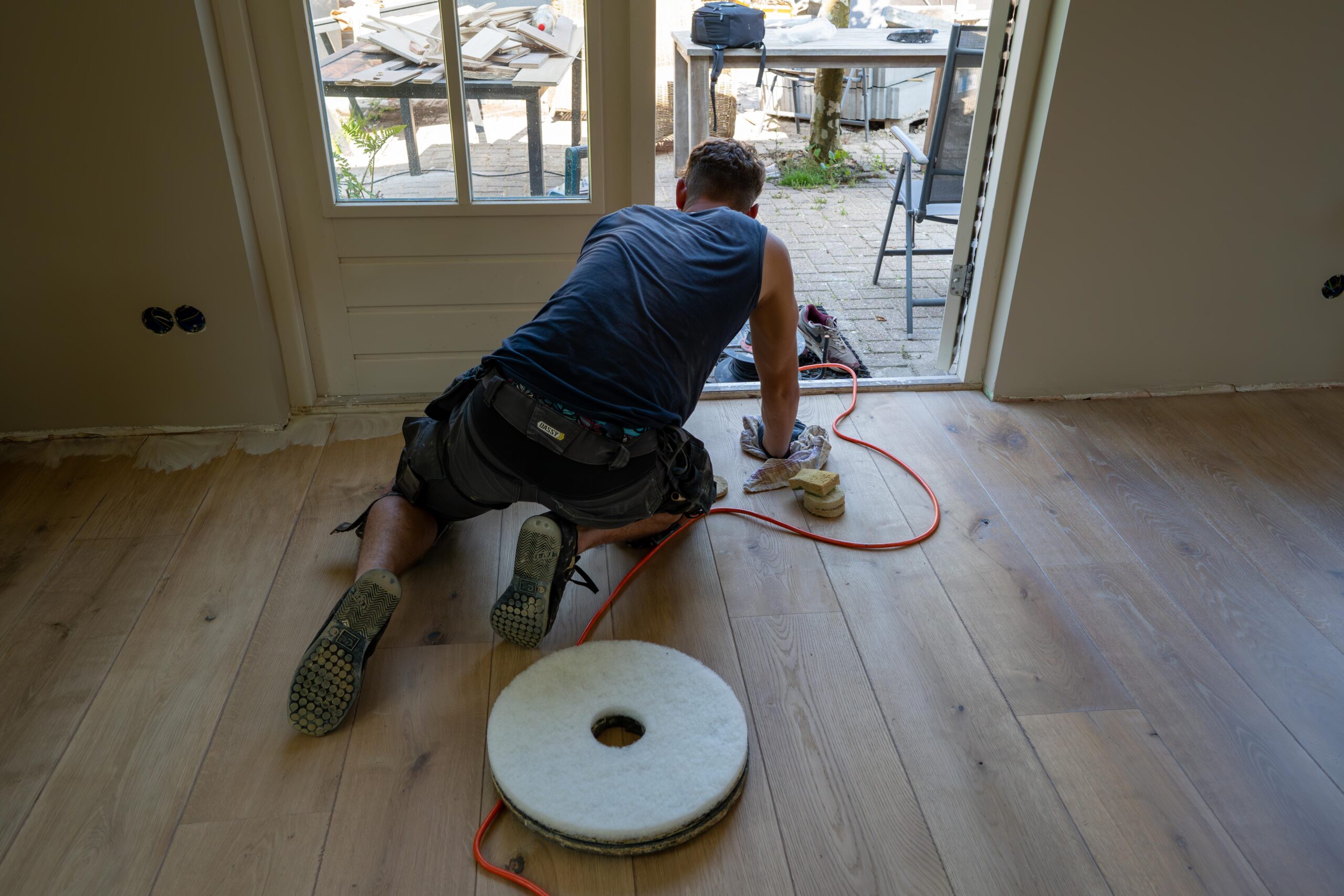 Het eindresultaat is een vloer die weer jaren meegaat én er als nieuw uitziet — met respect voor het karakter van het oorspronkelijke hout.